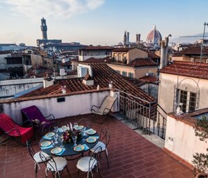 Luxury apartment with a fantastic roof terrace that overlooks the beautiful Firenze with a 360 degrees view. It has three large bedrooms and sleeps up to 6 people comfortably, lovely furnishings and well equipped kitchen.