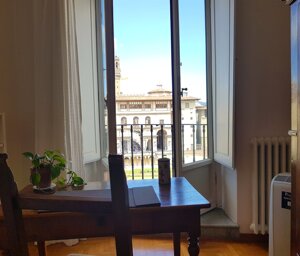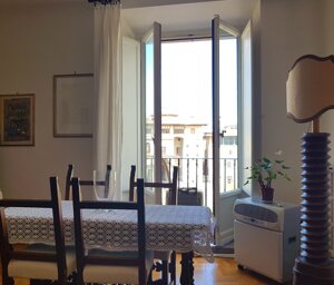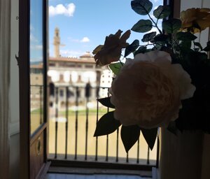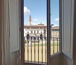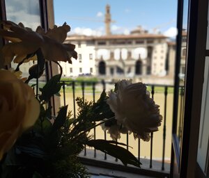 Sits up high on the 3rd floor (with elevator), in a lovely 17th century building. Just off the Ponte Vecchio and directly facing the Uffizi gallery. Magnificent view of the florentine hillside towns of Fiesole and Settignano. It has a picture postcard card view of the river Arno and Ponte Vecchio.
